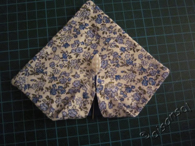 Encaramos las dos piezas, y las cosemos con puntada escondida, dejando una pequeña abertura para meter el relleno. Cerramos la abertura y colocamos un botón, una perla o el objeto que elijáis justo en el centro, tensado bien, para darle un poco de forma, de la misma forma que hacemos con los biscornus.